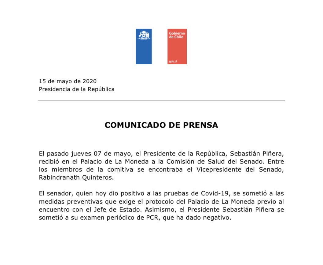 En otro ámbito, el coronavirus no solo ha afectado a la ciudadanía, sino que también llegó este viernes al Congreso: el vicepresidente del Senado, Rabindranath Quinteros, dio positivo en el examen PCR, lo que alarmó al gobierno debido a que el parlamentario estuvo presente el pasado 7 de mayo en una reunión junto a otras autoridades y el presidente Piñera, quien finalmente resultó negativo en el test de COVID-19.