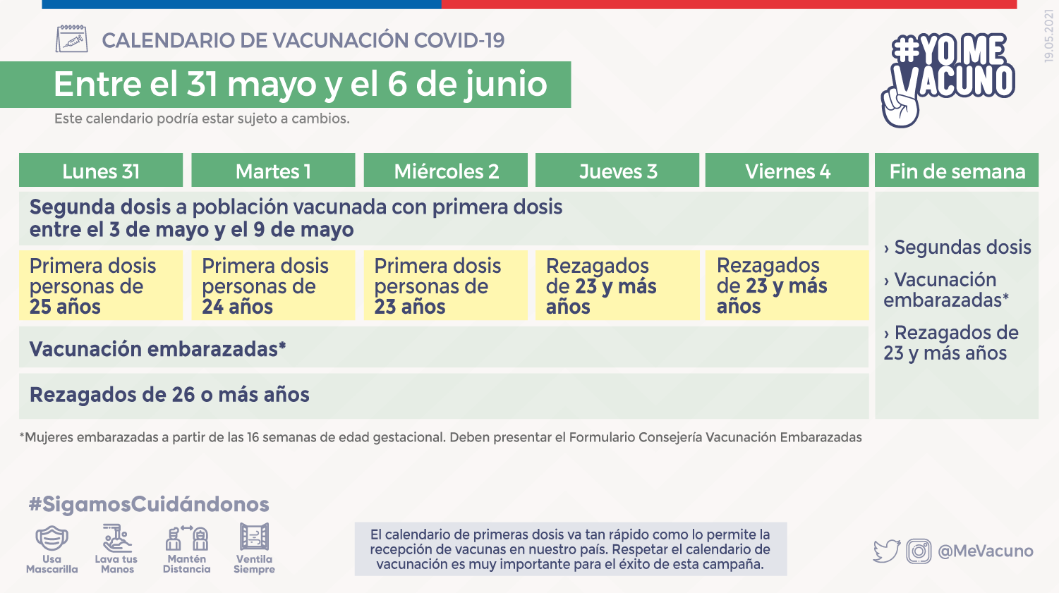 En forma paralela, durante la primera semana de junio serán inoculadas embarazadas a partir de las 16 semanas de gestación, quienes reciben segundas dosis y rezagados de 26 años o más.