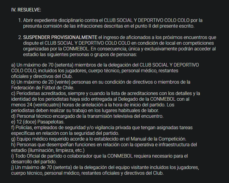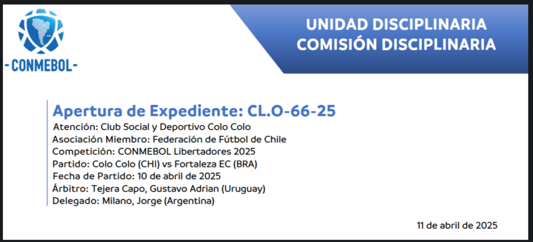 La Unidad Disciplinaria de la Conmebol se pronunció tras los graves incidentes ocurridos el Estadio Monumental este jueves, que llevaron a la suspensión del duelo entre Colo Colo y Fortaleza por Copa Libertadores.