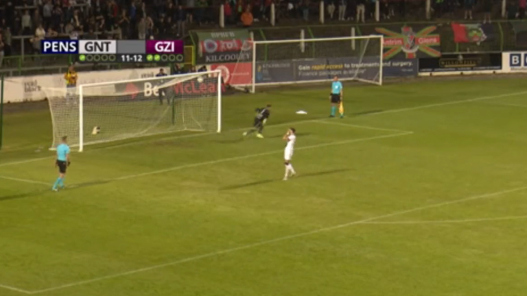 En una tanda de penales sumamente extensa, el jugador del Glentoran de Irlanda del Norte creyó que había tapado el lanzamiento, pero la trayectoria de la pelota tenía otros planes.