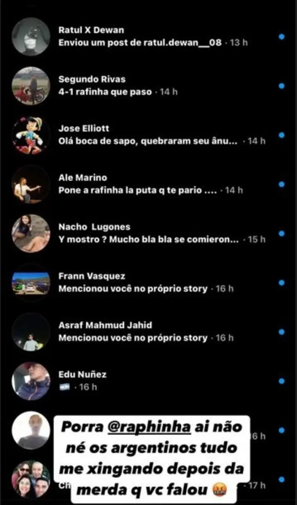 Primero, el ex Coritiba y Cruzeiro mostró un pantallazo con algunos de mensajes y disparó contra su compatriota. "Oh no los argentinos todos insultándome después de la mier... que dijiste", exclamó.