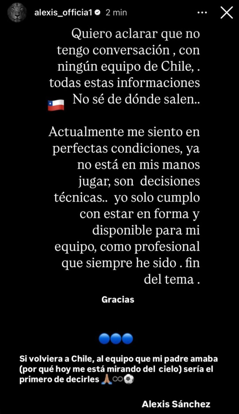 "Actualmente, me siento en perfectas condiciones, ya no está en mis manos jugar, son decisiones técnicas. Yo solo cumplo con estar en forma y disponible para mi equipo, como profesional que siempre he sido. Fin del tema", publicó.