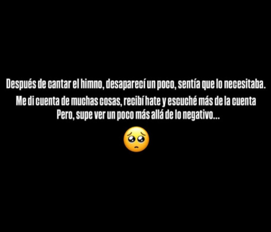 En una historia de Instragram, la influencer se desahogó con un profundo mensaje. "Después de cantar el himno desaparecí un poco, sentía que lo necesitaba", comentó.