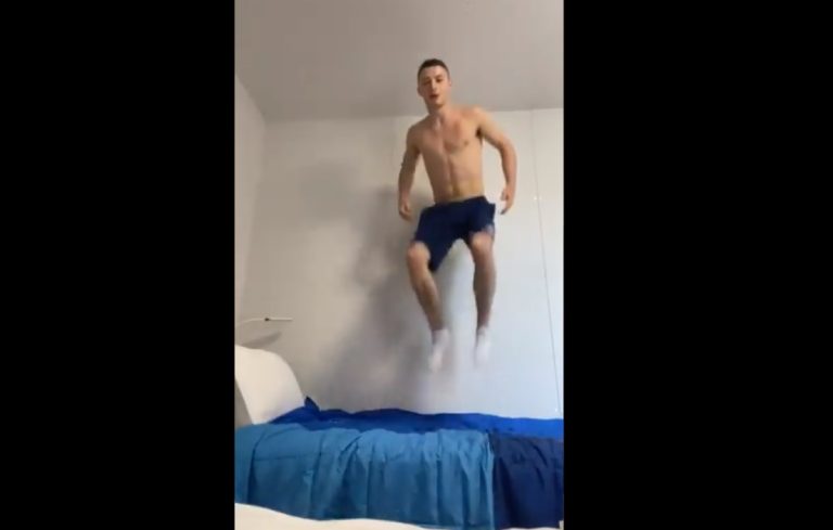 En el registro, compartido en su cuenta de Twitter, el atleta aparece saltando bruscamente en su dormitorio para comprobar la fragilidad de la cama, la que aparentemente resiste sin problemas.
