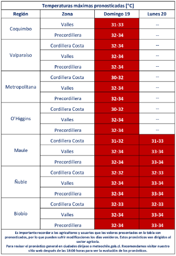 Según lo anunciado por el aviso meteorológico, las altas temperaturas empezarían a presentarse la tarde del día domingo, hasta la tarde día lunes, en sectores como el Maule, Ñuble y Biobío.