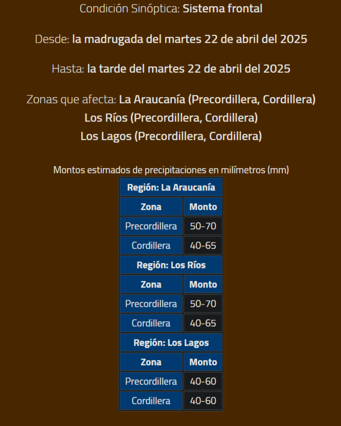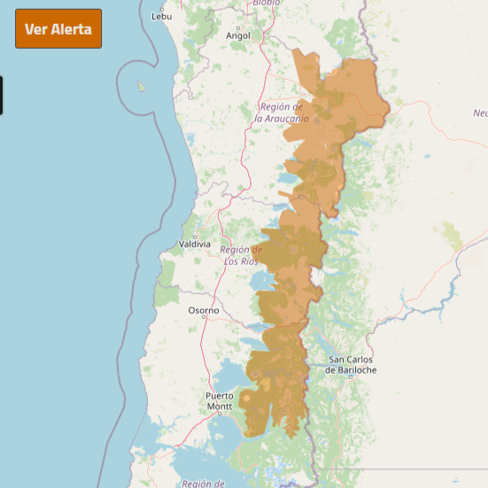 La alerta meteorológica es a causa de posibles precipitaciones en las regiones de La Araucanía, Los Ríos y Los Lagos, en las zonas precordilleranas y cordilleranas.