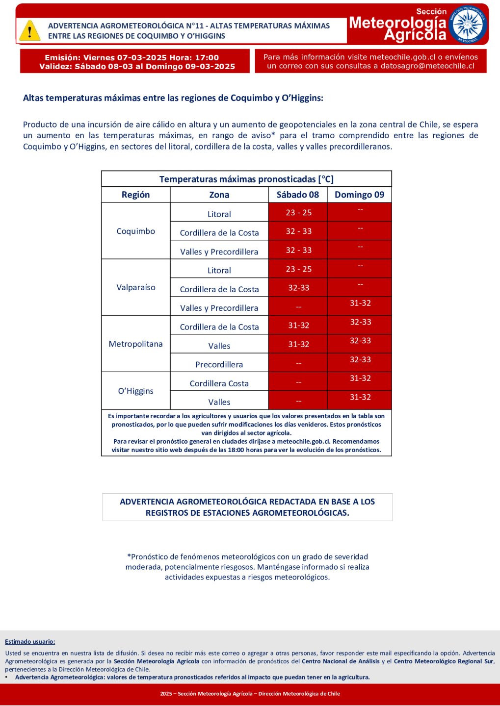 - Región de Coquimbo - Valles y precordillera: Temperaturas máximas de 32°-33°