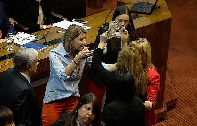 Al actuar de las parlamentarias se sumó la reacción del oficialismo, cuando la diputada Paulina Núñez les arrebató los papeles. Luego Erika Olivera arrebató uno.
