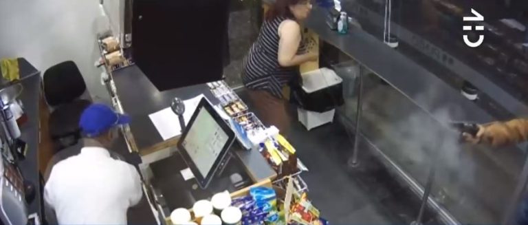 El registro audiovisual captado por la cámara de seguridad de una bencinera en Santiago registró el momento justo en que un delincuente dispara con un revolver a un trabajador de la estación de servicio.