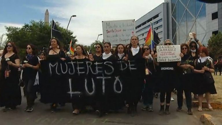 Un gran cartel negro encabezaba la marcha mientras las manifestantes portaban claveles blancos y alzaban sus manos, rindiendo honor a quienes han muerto producto de las manifestaciones.