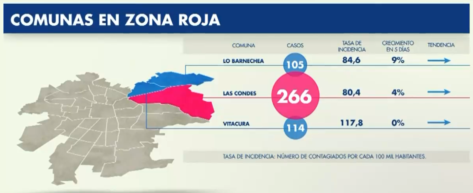 Esto respaldaría el levantamiento de cuarentena en las comunas de Lo Barnechea, Providencia y Vitacura. Esta última tiene un 0% de crecimiento de casos en los últimos 5 días, aún cuando tiene una tasa de incidencia de 117,8, mientras que Lo Barnechea presenta un crecimiento de 9% con tasa de 84,6.