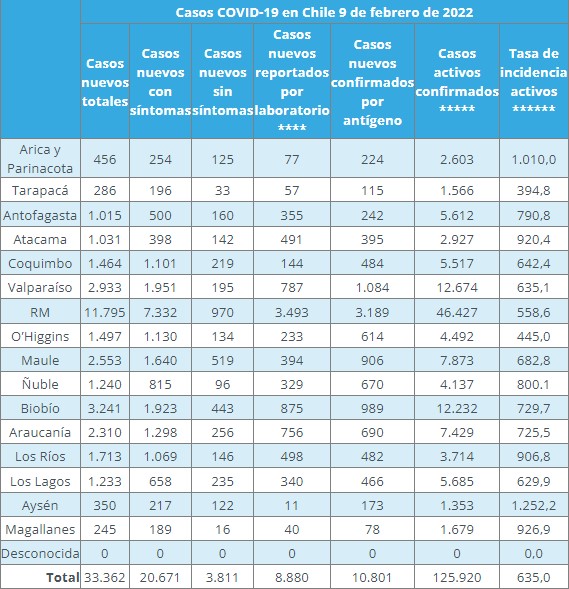 En el lado contrario, las regiones con menor cantidad de casos activos son Aysén, con 1.353; Tarapacá, con 1.566; Magallanes, con 1.679; Arica y Parinacota, con 2.603; y Atacama, con 2.927.