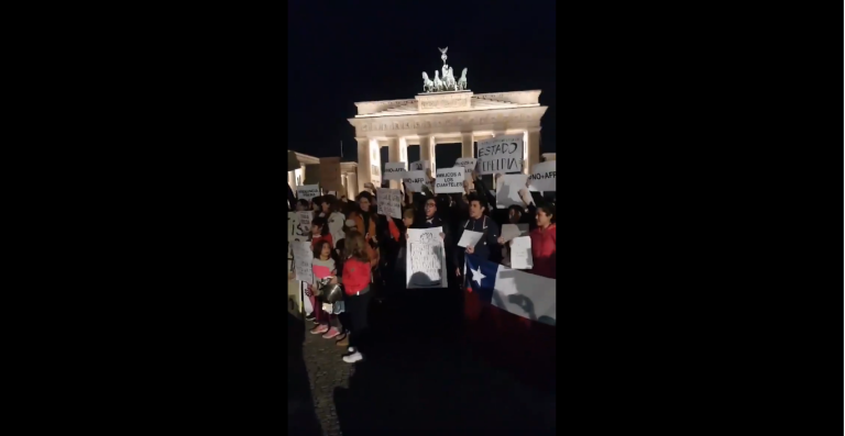 AHORA Chilenos frente a la embajada de Chile en Berlín, se manifiestan solidarizando con el pueblo de Chile y sus movilizaciones contra el gobierno de @sebastianpinera. pic.twitter.com/AYJevGk8oB— PIENSA.PRENSA (@PiensaPrensa) October 21, 2019