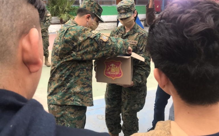 Personal militar llegó hasta el Centro de Protección Pudahuel para hacer entrega de 600 mascarillas, las cuales fueron confeccionadas por los mismos militares. Además, se realizaron labores de sanitización en salas de juego, comedores y gimnasios.