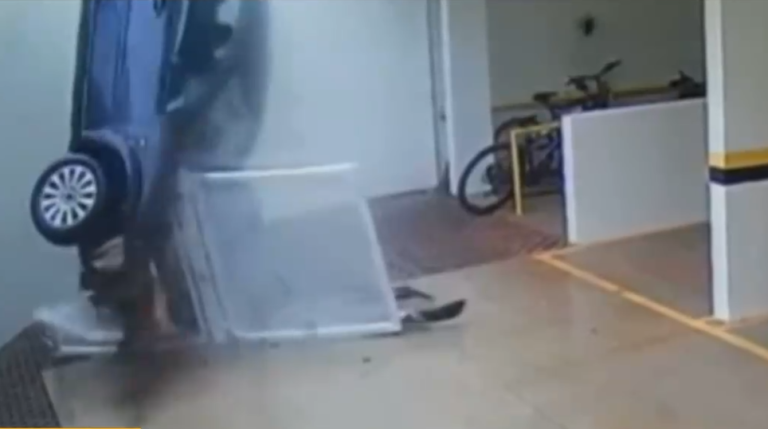 Un impresionante registro se dio a conocer en Brasil. Un video muestra el momento exacto en que un auto cayó a un estacionamiento de un condominio en el estado de Santa Catarina. Primero se estrella, verticalmente, contra una barrera que estaba instalada en el lugar. En total, fueron tres metros los que descendió el vehículo y afortunadamente no había nadie en el lugar, por lo que solo el automóvil resultó con daños. La conductora, quien estaba intentado hacer partir el auto, perdió el control, pero alcanzó a salir del vehículo antes de que éste cayera al salir por la puerta en una rápida maniobra.