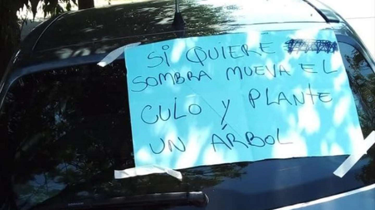 “Si quiere sombra, mueva el culo y plante un árbol”, escribió el residente en un papel que dejó sobre el parabrisas del automóvil y que pegó con cinta adhesiva para que por ningún motivo se volara.