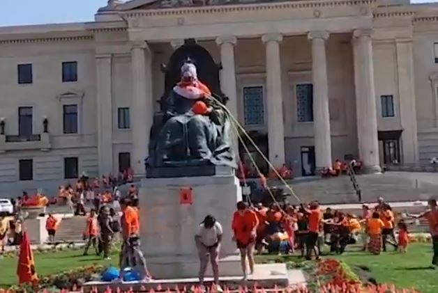 En Winnipeg, una multitud vitoreó cuando la estatua de la reina Victoria cayó fuera de la legislatura provincial de Manitoba. Los manifestantes, muchos de los cuales vestían ropa naranja, también patearon la estatua derribada y bailaron alrededor de ella. El pedestal y la estatua estaban pintados con marcas de manos de pintura roja.