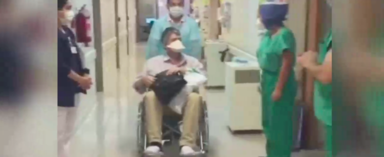Este lunes fue su último día hospitalizado y al salir de su habitación, en silla de ruedas, el personal del recinto, médicos, enfermeras y técnicos, lo esperaron con emocionantes aplausos para despedir a quien fuese el paciente más grave que trataron durante más de un mes.