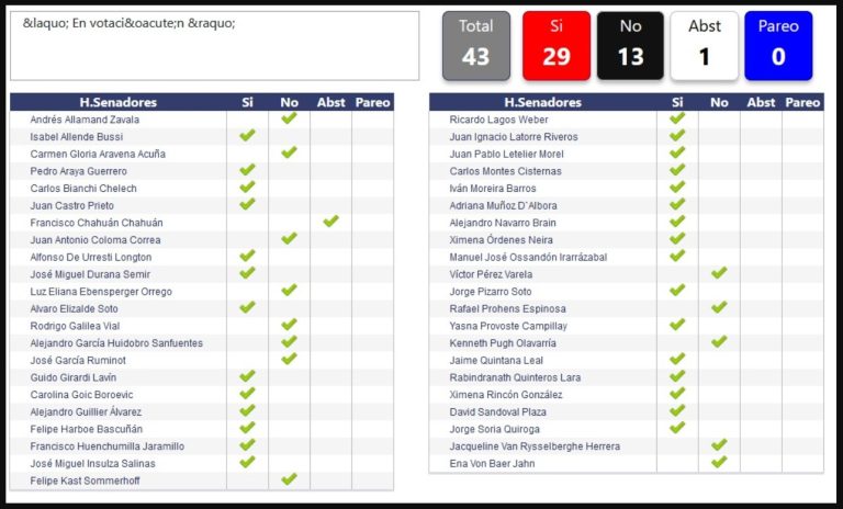 Por 29 a favor, 13 en contra y una abstención, la iniciativa fue aprobada. Ahora, existirían dos escenarios disponibles en el camino del Ejecutivo. Primero, podría vetar el proyecto, lo que podría ser superado si ambas cámaras superan los 2/3 de la votación, sumando una nueva derrota para el gobierno.