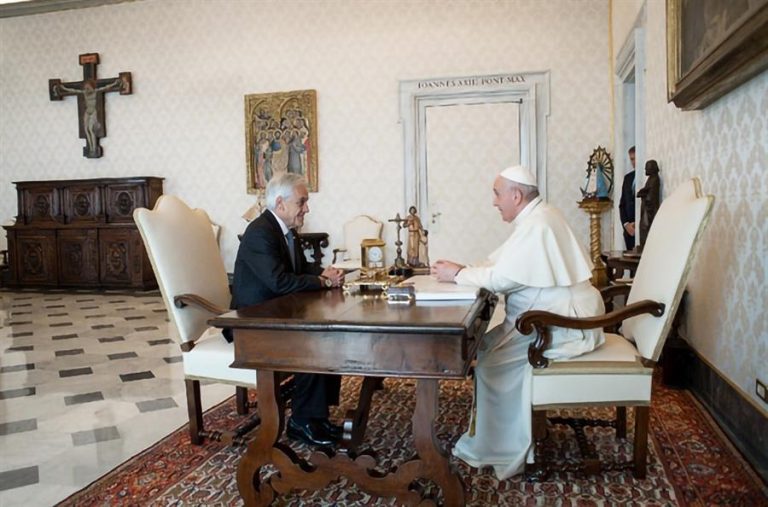 (EFE) – El papa Francisco y el presidente Sebastián Piñera dialogaron este jueves sobre el “proceso de reforma de la Constitución” en el que está embarcado Chile, así como de las relaciones con la Iglesia, durante su encuentro en el Vaticano, parte de la gira europea del mandatario.