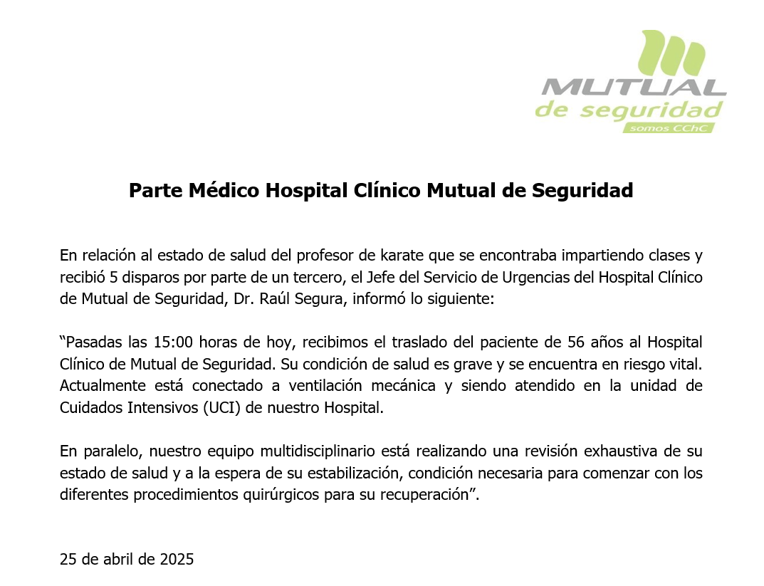 "Pasadas las 15:00 horas de hoy, recibimos el traslado del paciente de 56 años al Hospital Clínico de Mutual de Seguridad. Su condición de salud es grave y se encuentra en riesgo vital. Actualmente está conectado a ventilación mecánica y siendo atendido en la unidad de Cuidados Intensivos (UCI) de nuestro Hospital", informaron.