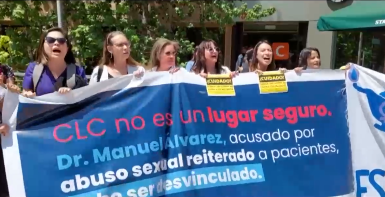 Doctores y enfermeros participaron de una manifestación en la Clínica Las Condes. Exigen que el oncólogo Manuel Álvarez, acusado de abuso sexual reiterado, sea desvinculado del centro asistencial. Reunieron más 1.600 cartas de médicos que piden que el doctor sea apartado de sus funciones. Este miércoles es la audiencia de preparación del juicio oral.