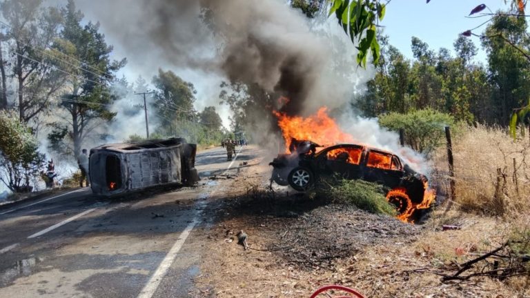 El accidente lo protagonizaron dos vehículos menores, los cuales chocaron de frente. Debido al fuerte impacto, que provocó el volcamiento y fuego en los autos, cuatro personas perdieron la vida y otra se mantiene en riesgo vital, según informó Radio Biobío. Además, en el lugar se generó un incendio forestal.