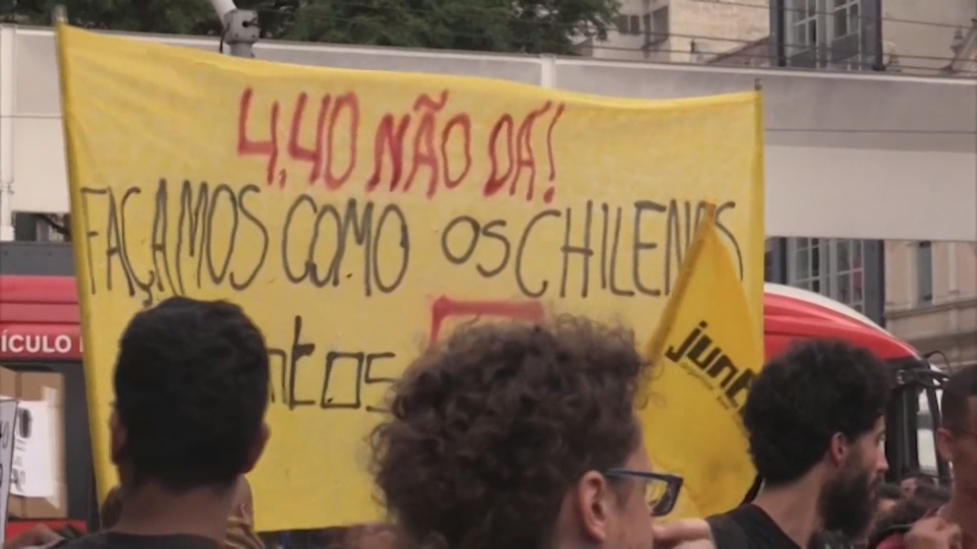 Alrededor de 600 personas salieron a las calles de Sao Paulo a manifestarse en contra del incremento de los buses públicos, cuyo valor llegó a los 440 reales, unos 830 pesos chilenos. "La juventud chilena es una inspiración", dijo uno de los participantes.