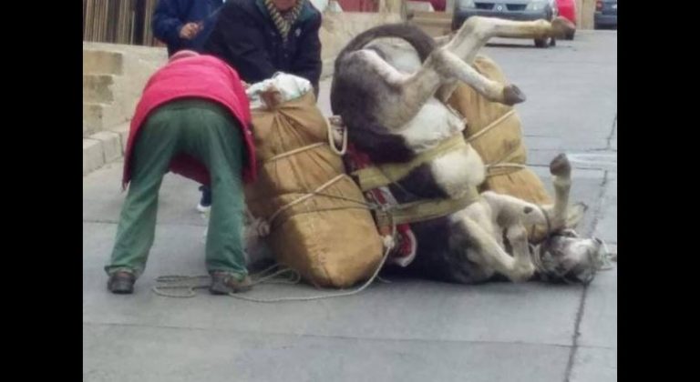 Impactante caso de maltrato animal: Burro cayó al suelo por exceso de carga y sus imágenes se viralizaron