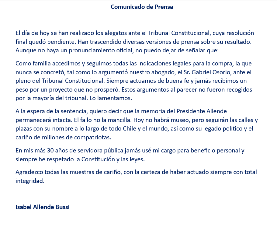 "A la espera de la sentencia, quiero decir que la memoria del Presidente Allende permanecerá intacta. El fallo no la mancilla. Hoy no habrá museo, pero seguirán las calles y plazas con su nombre a lo largo de todo Chile y el mundo, así como su legado político y el cariño de millones de compatriotas", agregó.