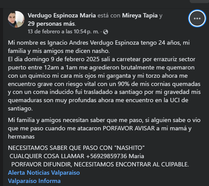 A través de redes sociales una familia realizó una grave denuncia al señalar que un de joven 24 años, identificado como Ignacio Verdugo Espinoza, se encuentra en risesgo vital tras un brutal ataque en Valparaíso.