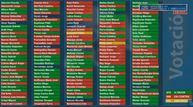 La mayoría de los parlamentarios de oposición respaldó la iniciativa, que de hecho, fue impulsada por las diputadas Maite Orsini (RD), Karol Cariola (PC), Camila Vallejo (PC), Natalia Castillo (IND), Daniella Cicardini (PS), Cristina Girardi (PPD), Claudia Mix (Comunes), Emilia Nuyado (PS), Camila Rojas (CS) y Gael Yeomans (CS).