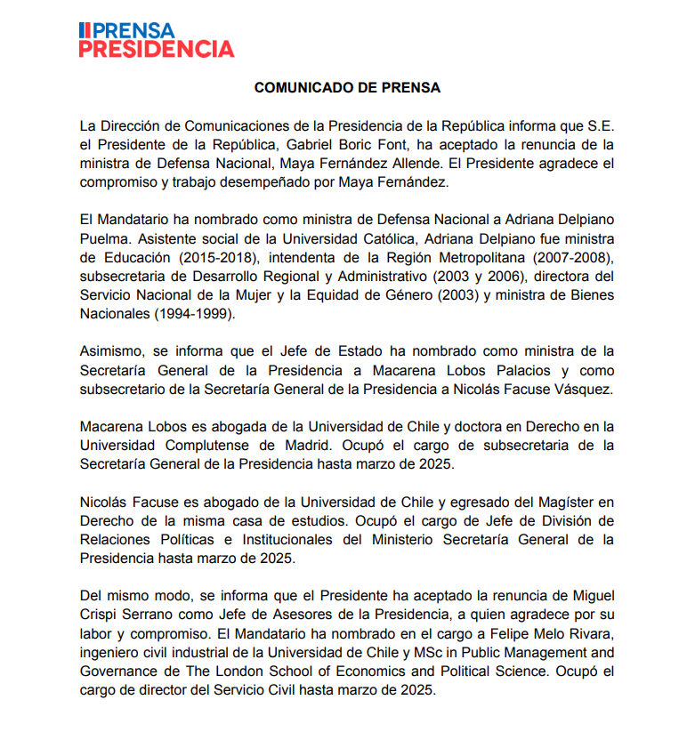 "La Dirección de Comunicaciones de la Presidencia de la República informa que S.E. el Presidente de la República, Gabriel Boric Font, ha aceptado la renuncia de la ministra de Defensa Nacional, Maya Fernández Allende. El Presidente agradece el compromiso y trabajo desempeñado por Maya Fernández", se indica en el comunicado.