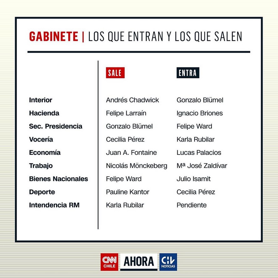 Andrés Chadwick saldría del ministerio de Interior, Felipe Larraín de Hacienda y Cecilia Pérez de Secretaría General de Gobierno. Juan Andrés Fontaine dejaría Economía y Gloria Hutt haría lo mismo en Transportes y Telecomunicaciones.