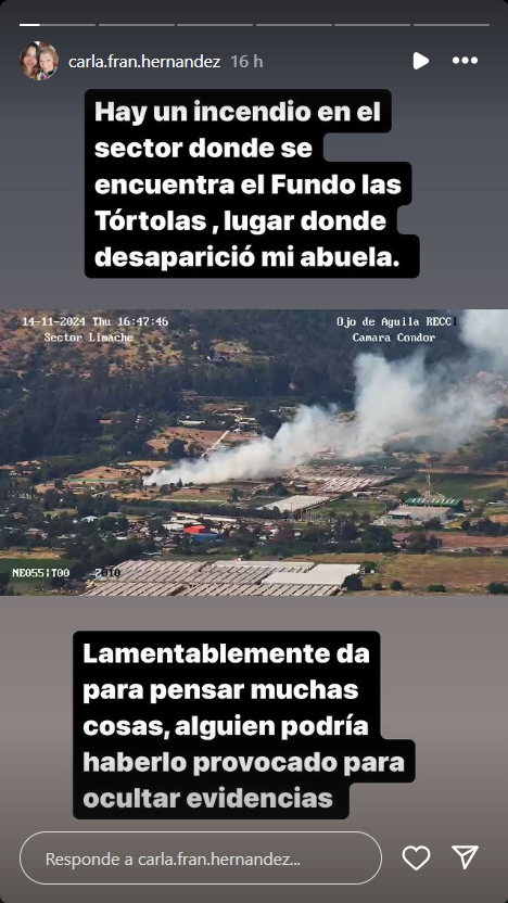 "Hay un incendio en el sector donde se encuentra el Fundo Las Tórtolas, lugar donde desapareció mi abuela", comenzó escribiendo Carla en sus historias, donde también adjuntó una fotografía de la emergencia.