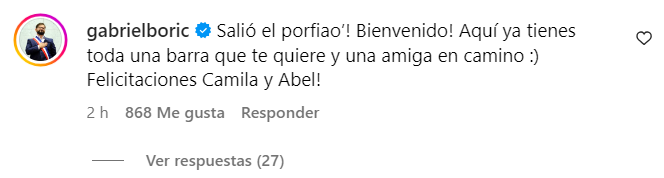 A través de una respuesta en Instagram a la ministra Camila Vallejo por el nacimiento de su hijo, el mandatario reveló cuál es el sexo de su primer hijo.