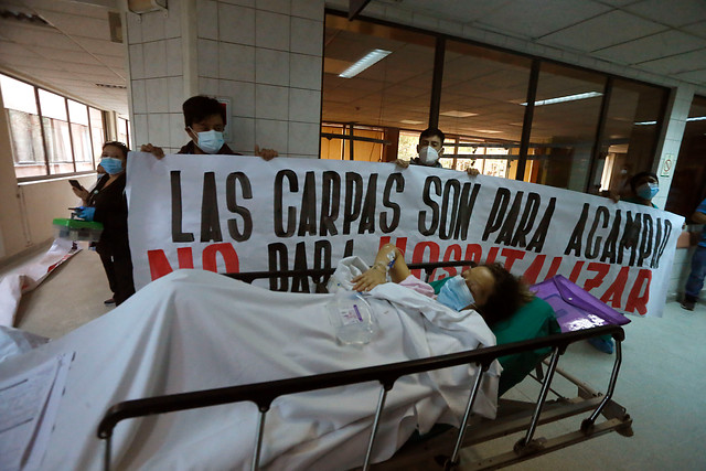 En ese contexto, los trabajadores de la salud desplegaron una serie de lienzos con consignas como “Que la dignidad se haga costumbre en la vida y la muerte” y “Las carpas son para acampar, no para hospitalizar”.