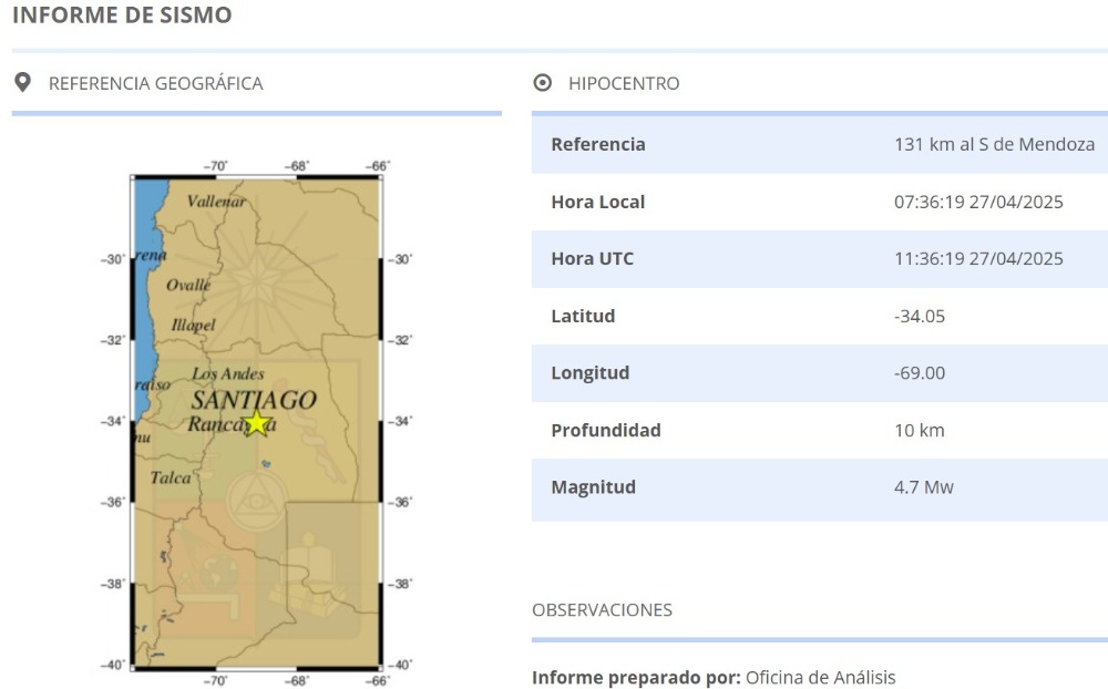 Según el Centro Sismológico de la Universidad de Chile, el movimiento tuvo una magnitud de 4.7 y su epicentro se ubicó a 131 kilómetros al sur de Mendonza.