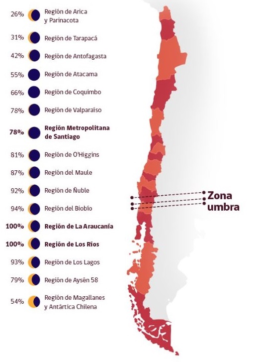Mientras que el mayor provecho del eclipse que se verá el 14 de diciembre de 2020 estará en las regiones de La Araucanía y Los Ríos.