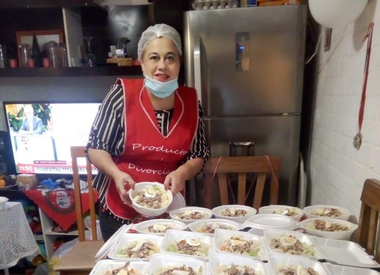 “Mi amor por la cocina es más fuerte y el amor por la gente también. Entonces hablé con estas personas y les dije que hiciéramos una locura de amor por la gente que se está quedando sin trabajo y sin algo que comer, además de prevenir que el abuelito saliera a la calle a comprarse el pancito, porque también hacemos pan amasado, sopaipillas, empanadas, tengo alguien que me regala leche y las vamos a dejar a las casas”, relata Hilda.