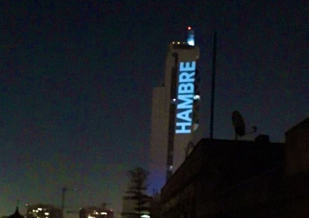 Durante la noche de este lunes, una palabra se proyectó en el edifico Telefónica y es visible desde varios sectores de la capital: “Hambre”.