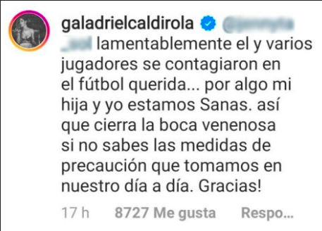 Este mensaje sacó ronchas en la española quien lo respondió de manera tajante: "Lamentablemente él y varios jugadores se contagiaron en el fútbol querida, por algo yo y mi hija estamos sanas. Así que cierra la boca venenosa si no sabes las medidas de precaución que tomamos en nuestro día a día. Gracias".