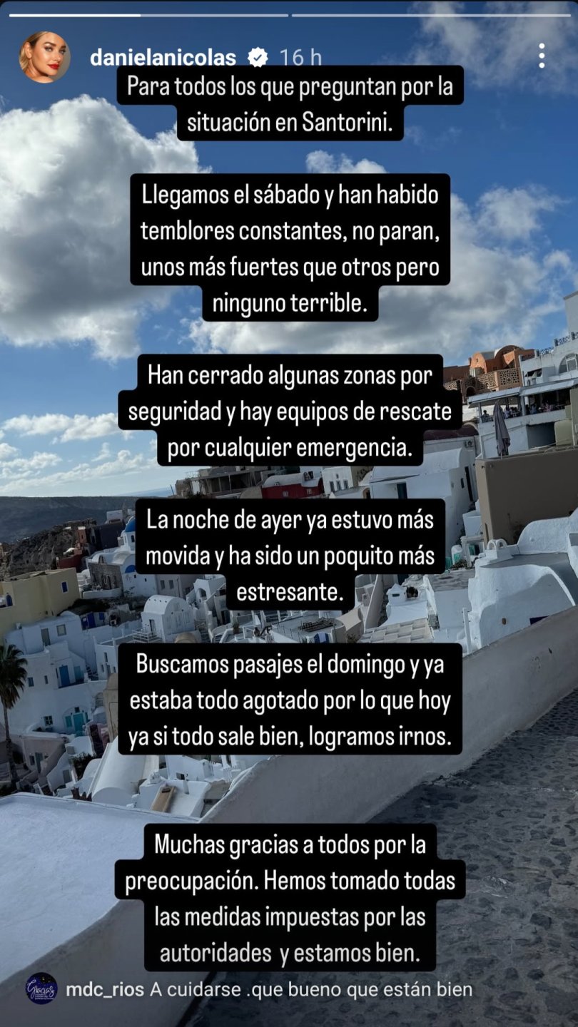 “Para todos los que preguntan por la situación en Santorini, llegamos el sábado y han habido temblores constantes, no paran, unos más fuertes que otros, pero ninguno terrible”, señaló.