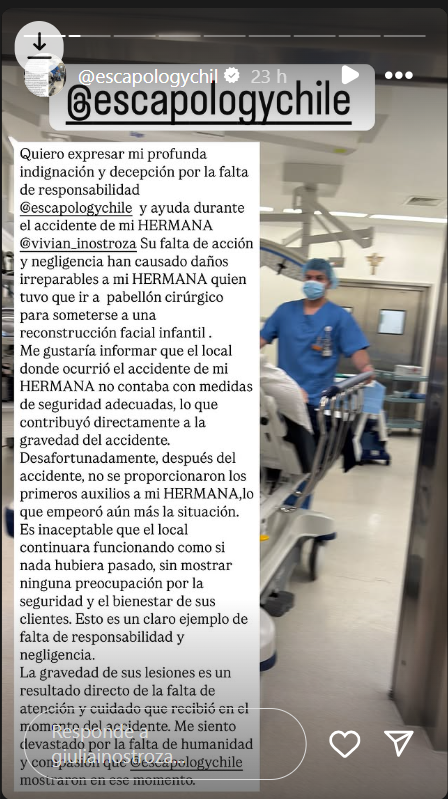 Vivian Inostroza estaba celebrando un cumpleaños en un scape room cuando sufrió un grave accidente. Según explicó su madre, la menor no fue asistida y casi pierde la vista. Fue sometida a reconstrucción facial infantil.
