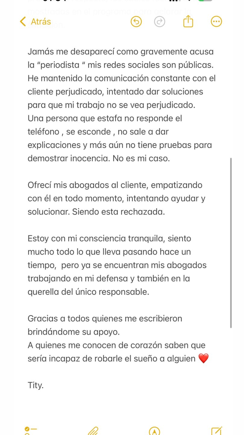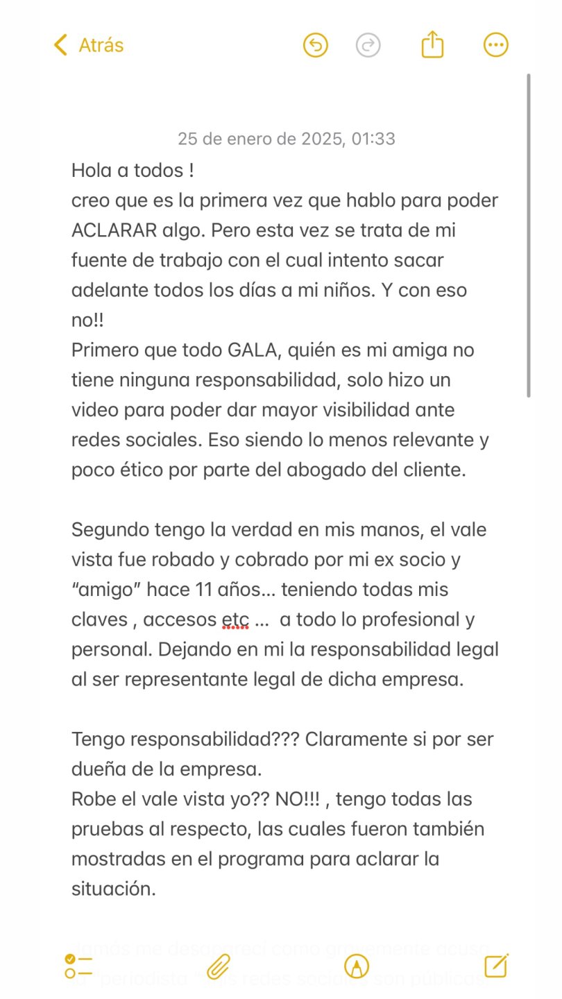 "Tengo la verdad en mis manos, el vale vista fue robado y cobrado por mi ex socio y 'amigo' hace 11 años, teniendo todas mis claves, accesos, etc (...) ¿Tengo responsabilidad yo? Claramente sí, por ser la dueña de la empresa ¿Robé el vale vista yo? ¡No!", señaló Titi.