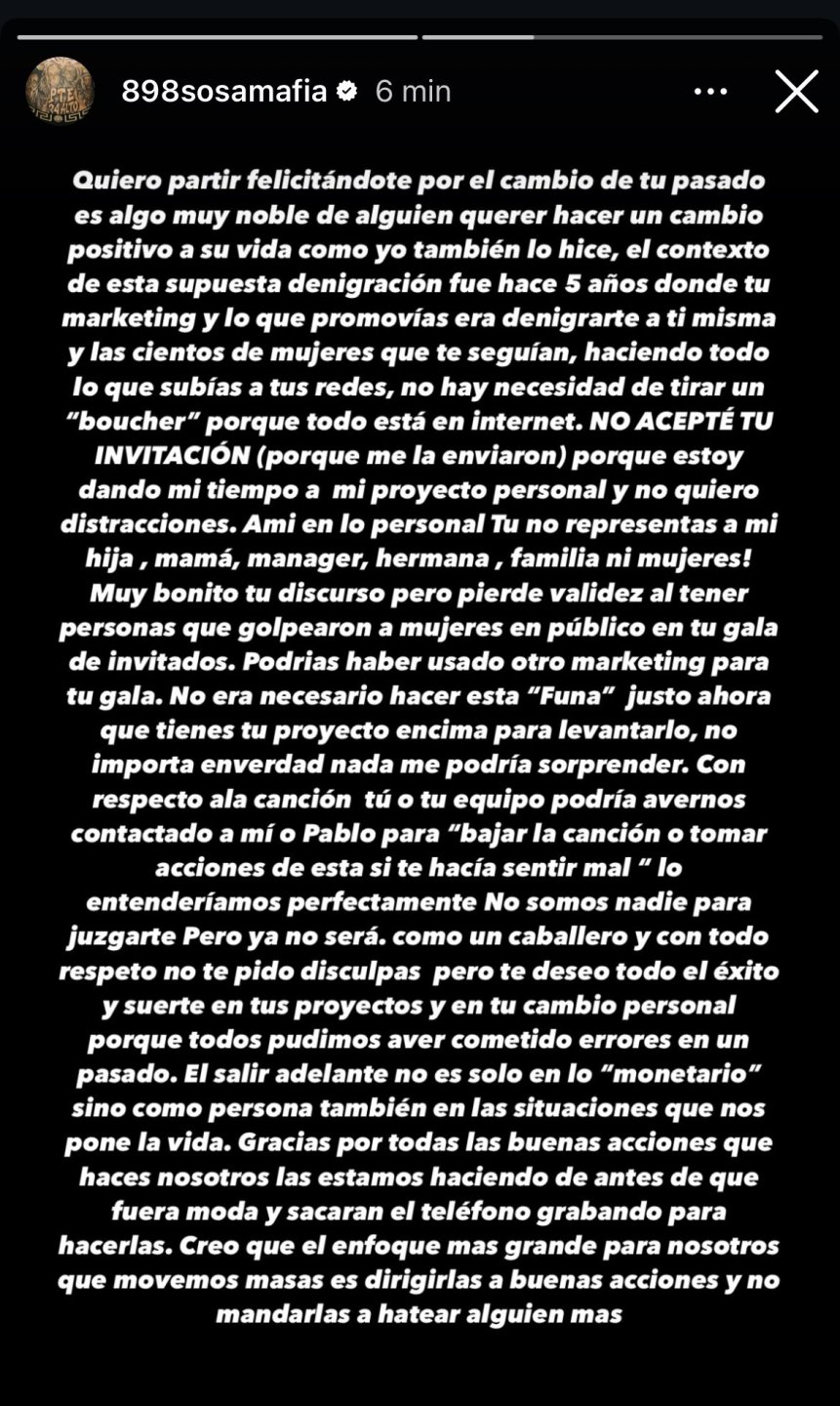 "Con respecto a la canción, tú o tu equipo podría habernos contactado a mí o a Pablo para bajarla o tomar acciones si te hacía sentir mal", complementó Sosa. "Entenderíamos perfectamente, no somos nadie para juzgarte, pero ya no será", apuntó.