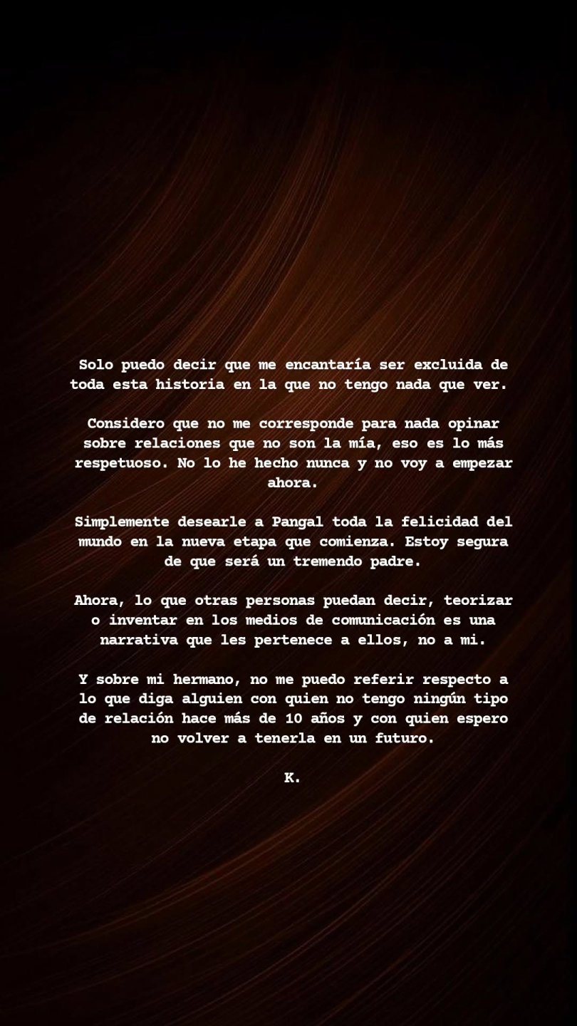 En este contexto, fue enfática en aclarar: "Sobre mi hermano, no me puedo referir respecto a lo que diga alguien con quien no tengo ningún tipo de relación hace más de 10 años y con quien espero no volver a tener en un futuro".