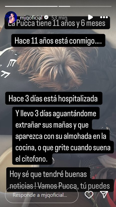 Se trata de su perrita, llamada Pucca, que tiene 11 años y seis meses de vida. "Hace 11 años está conmigo... Hace 3 días está hospitalizada", indicó la artista en su cuenta de Instagram.