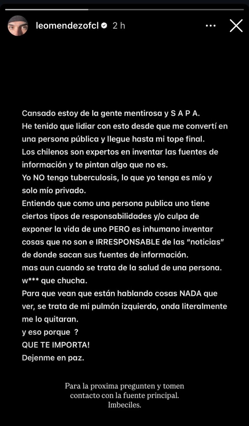 "Cansado estoy de la gente mentirosa y sapa. He tenido que lidiar con esto desde que me convertí en una persona pública y llegué hasta mi tope final", partió diciendo el joven en su cuenta de Instagram.