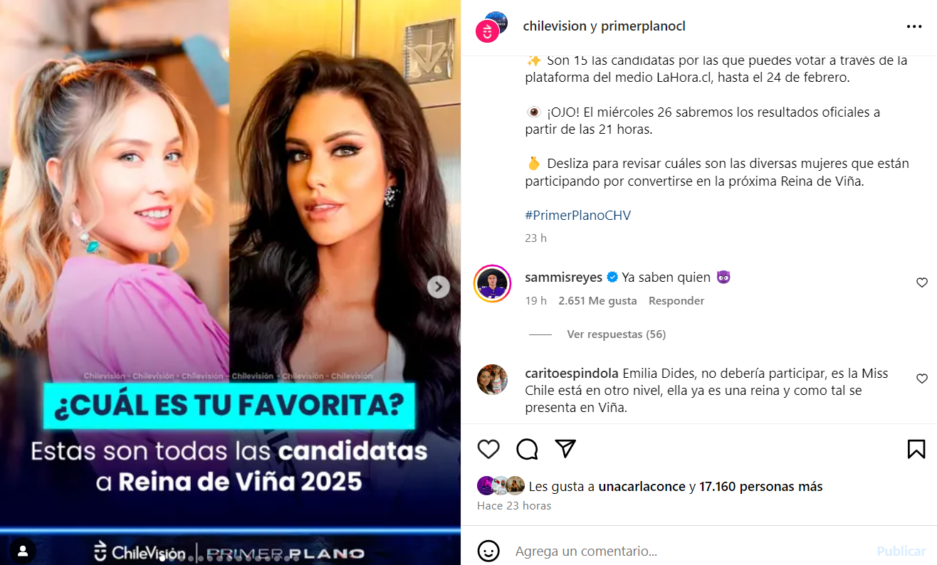Resulta que en las cuentas de Instagram de Chilevisión y Primer Plano se compartió una publicación con la Miss Chile como protagonizar sobre las candidatas y cómo votar a Reina del próximo Festival de Viña 2025.